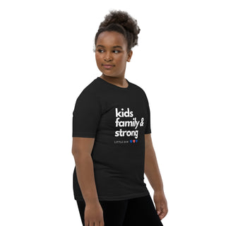 T-shirt unisexe LRS pour ado avec le message « Kids Family & Strong». Fabriqué en coton doux, il procure un confort optimal tout en affichant un message positif et inspirant. Montrez vos valeurs pour la famille avec ce t-shirt tendance et confortable.